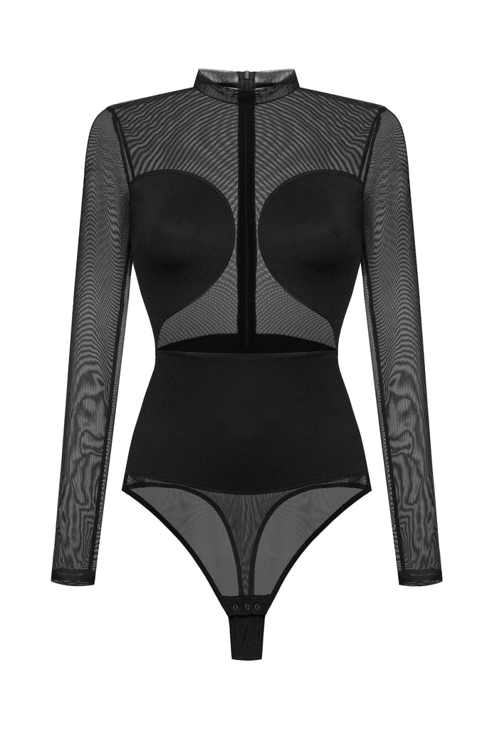 - Bodysuit made of combined fabrics with a low-cut turtleneck.