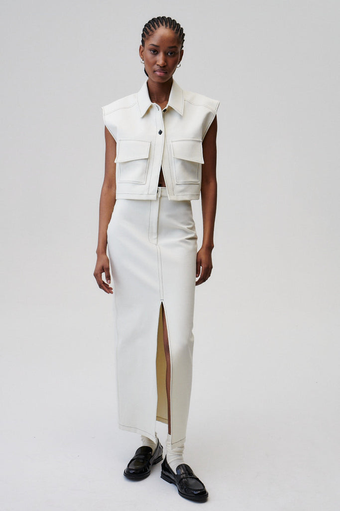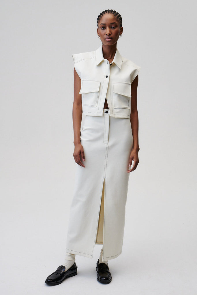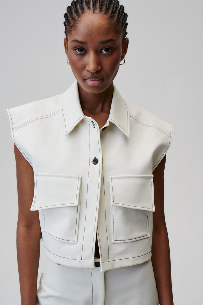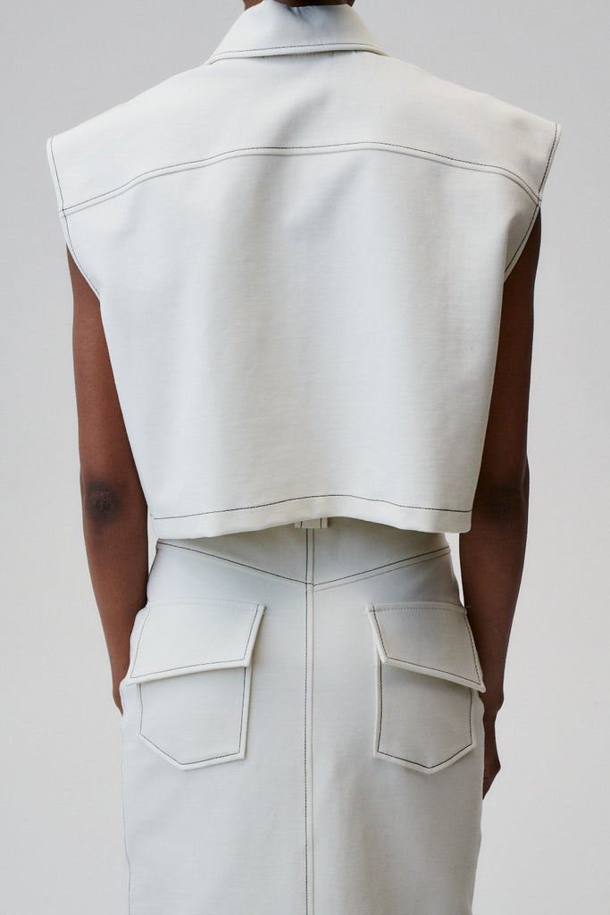 The Heavenly Top is where structure meets effortless cool. Designed with a cropped silhouette, strong shoulders, and oversized flap pockets, it brings a bold yet refined edge to any outfit. The contrast stitching adds a modern touch, while the structured fabric ensures a sharp, tailored look. Wear it as a standalone statement piece or pair it with the Soft Gaze Skirt for a sleek, monochrome ensemble.