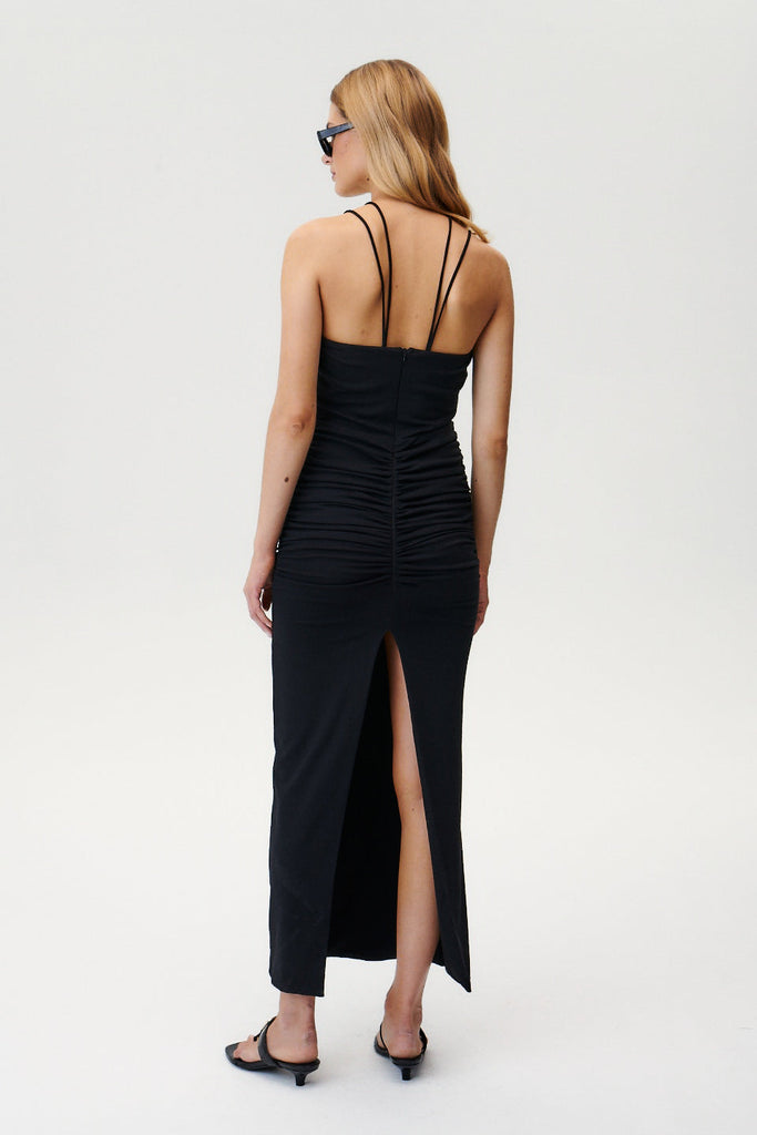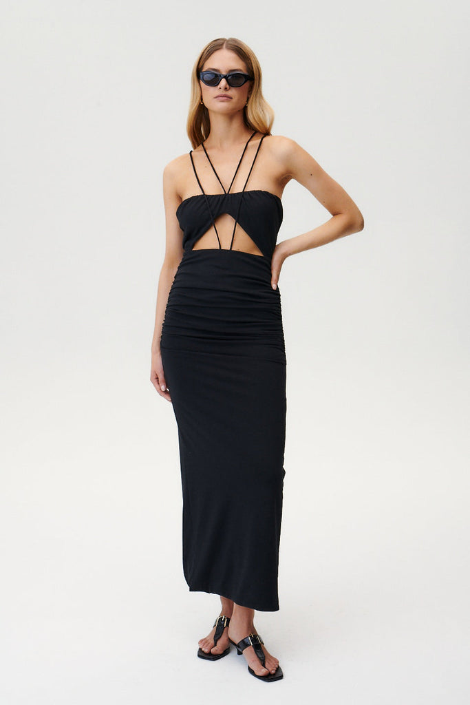 This elegant maxi dress combines sensuality with sophistication. Sleeveless with thin straps that subtly accentuate the shoulders, it creates a feminine, flattering silhouette. The draping along the body adds a touch of refinement, while the triangle cut-out at the stomach adds a daring element. The back features a center cut-out for an extra hint of allure. Perfect for evening outings, romantic dinners, or special occasions, this dress will make you feel unforgettable.