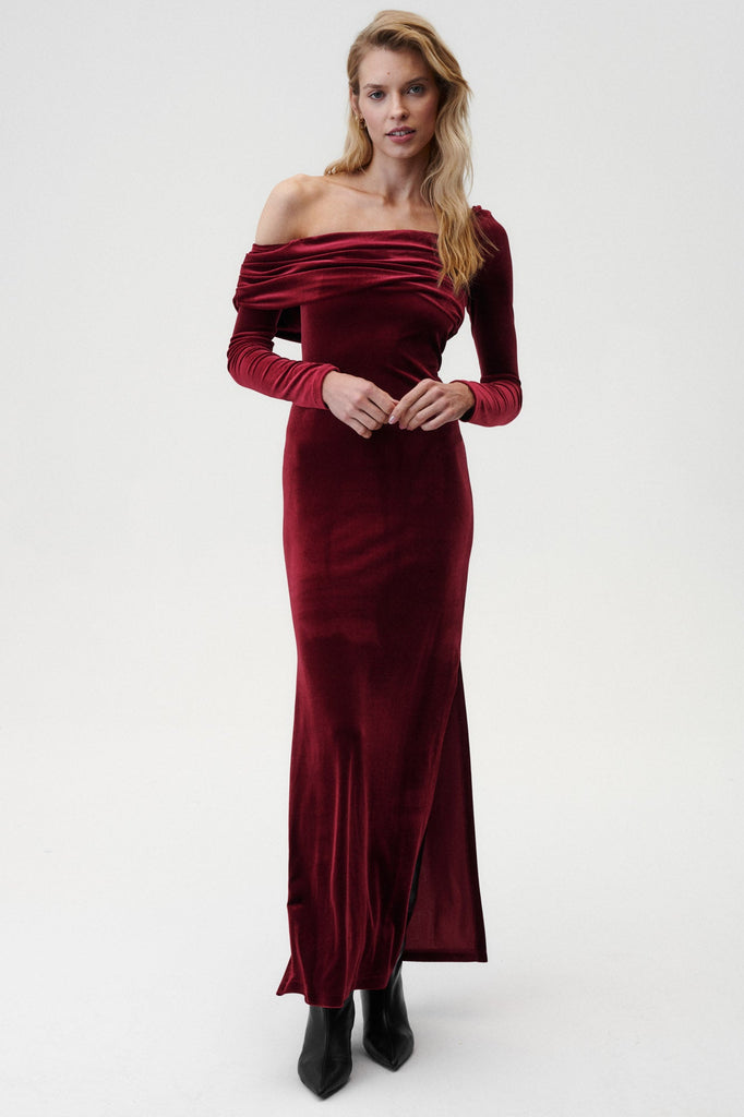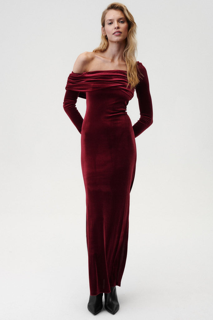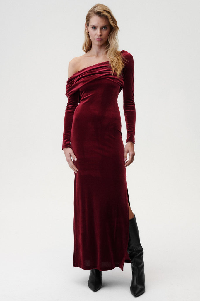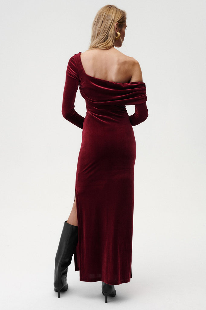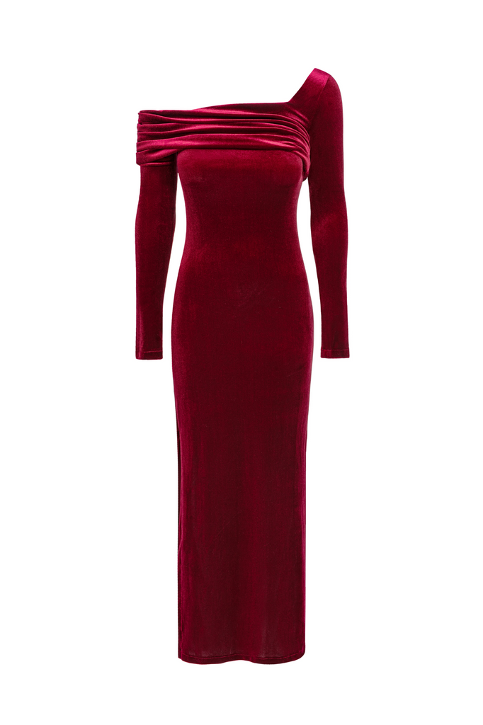 It is a stunning example of timeless sophistication. Made from soft velvet, this maxi-length dress features a striking one-shoulder design that beautifully highlights your neckline and shoulders. The elegant draping adds a touch of glamour, creating a graceful silhouette perfect for formal events.Â