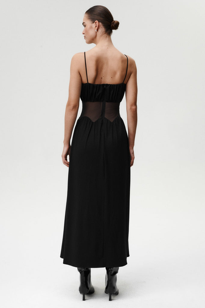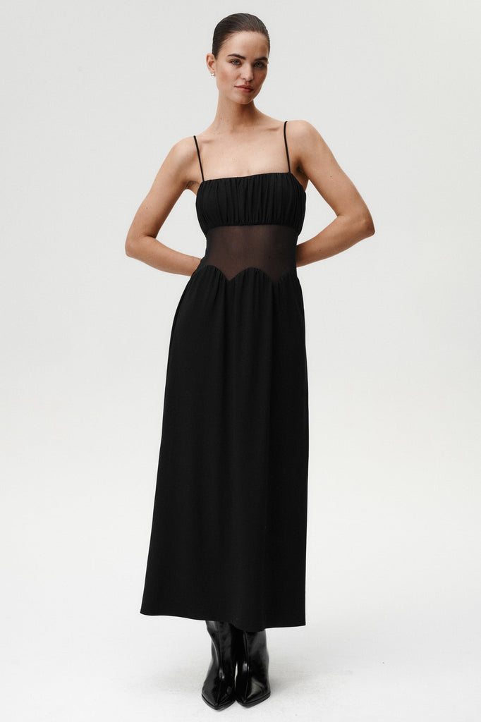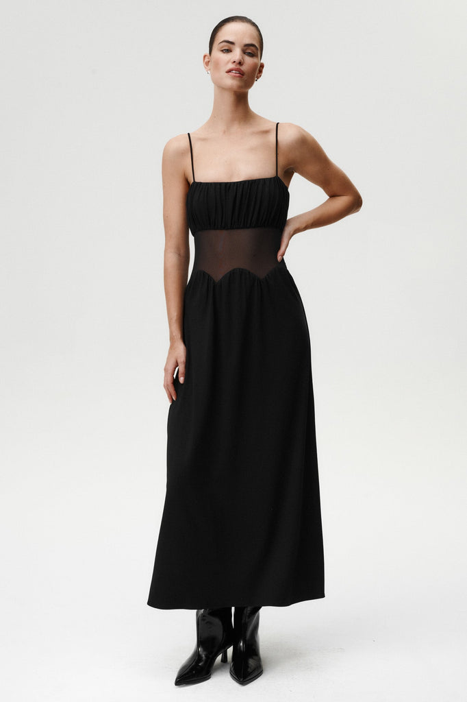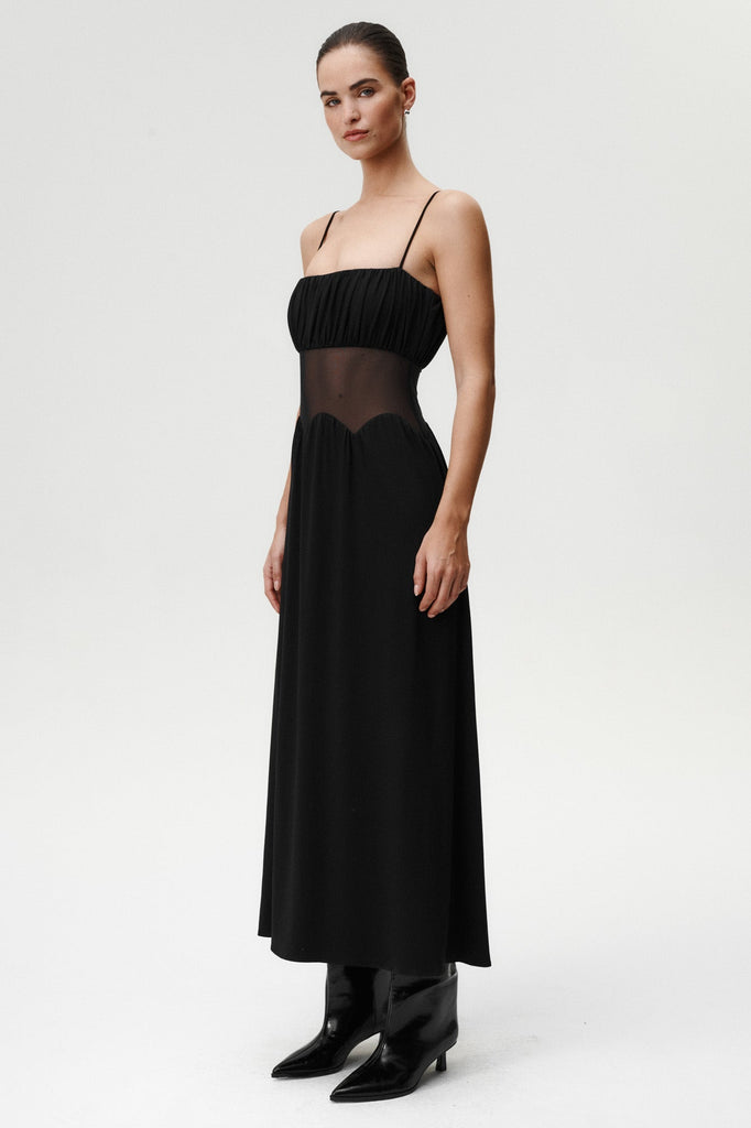 Graceful meets seductive in the La Perla Dress — a captivating midi silhouette that embodies effortless sophistication. With two delicate straps and a flowing fit, it evokes the feeling of a ballerina in motion. A sculpted wave detail at the waist blends sheer mesh and soft viscose, offering a subtle reveal that’s both elegant and sensual. Underneath, a built-in bodysuit ensures the mesh lays flawlessly against the body while providing comfort and ease. Feminine, refined, and beautifully bold, the La Perla lets you move like a dancer — light, confident, and unforgettable.