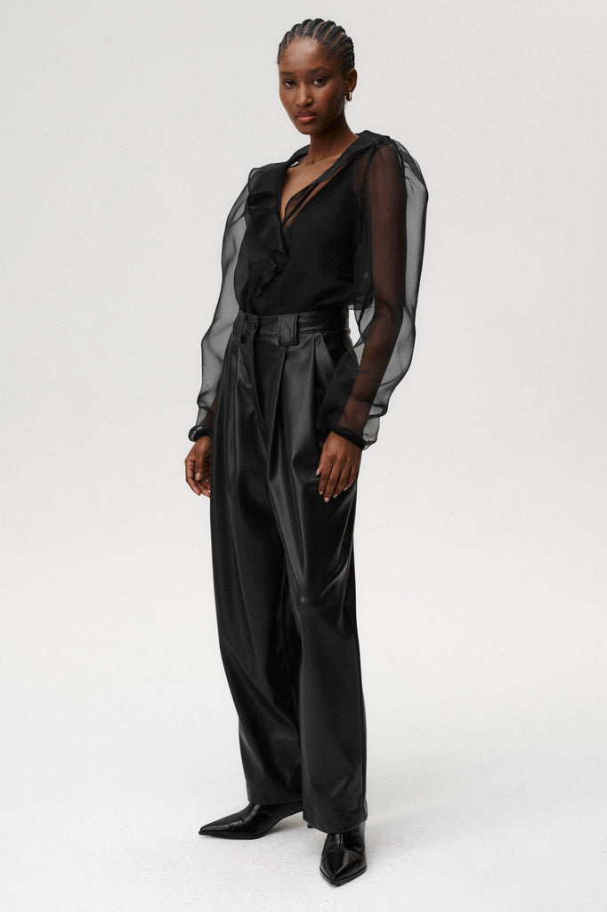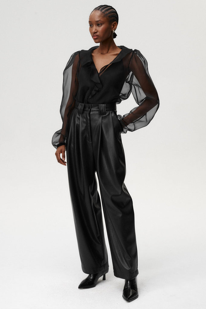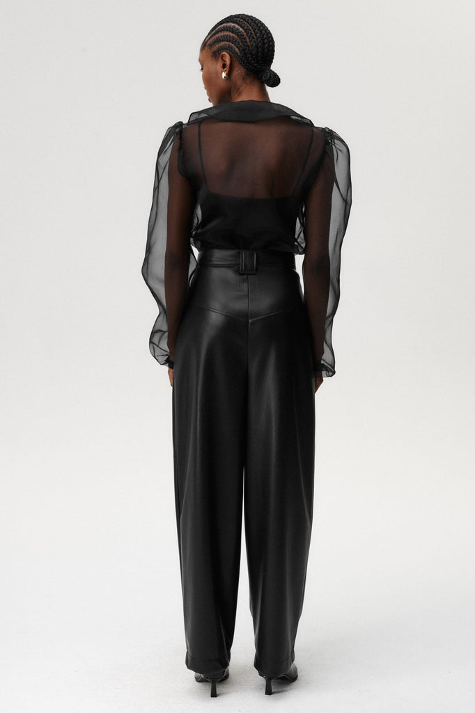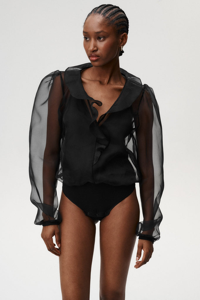 The Camille Bodysuit redefines everyday elegance with a touch of bold refinement. Sheer silk organza lined with soft tencel, create a light, layered effect that feels both feminine and modern. Tencel lining gives you full coverage, while organza keeps this piece airy and sheer. A clean V neckline with subtle detailing frames the collarbone, while voluminous sleeves finished with elastic cuffs add graceful movement. Designed to transition seamlessly, Camille is polished enough for the office and striking enough for an elegant dinner party. It's a piece that proves sophistication is never limited to one occasion.