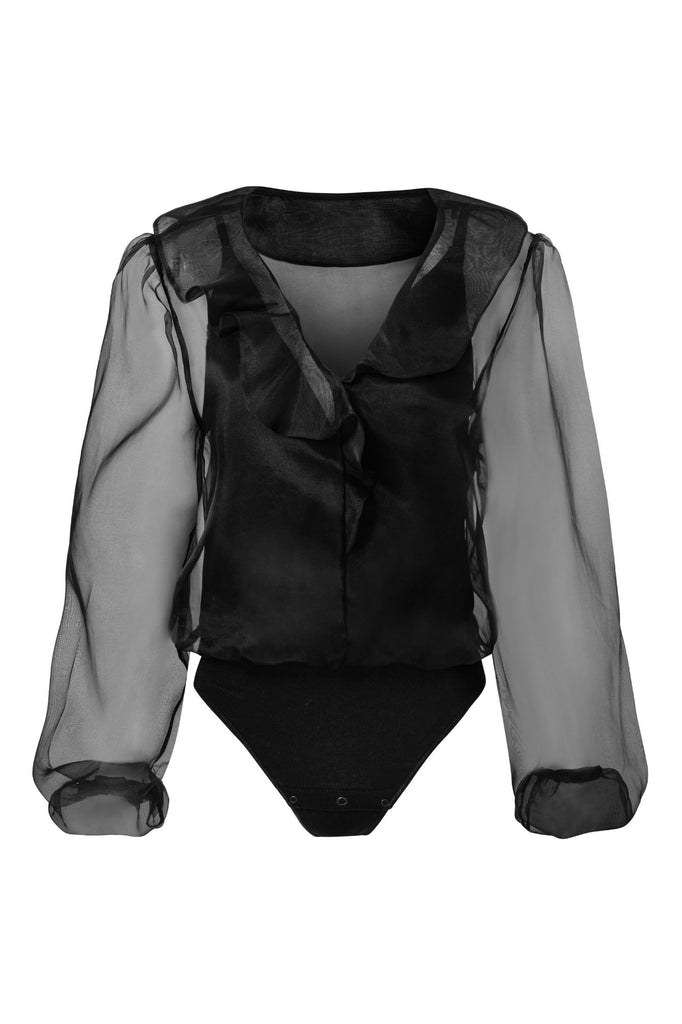 - Sheer silk organza bodysuit with soft tencel lining for full coverage.