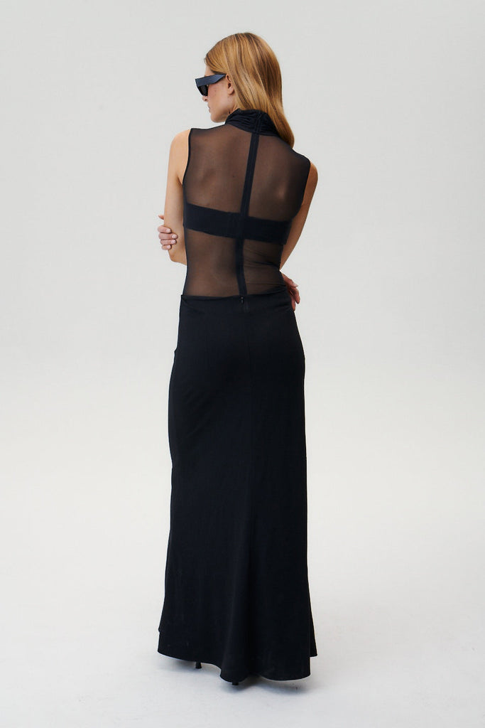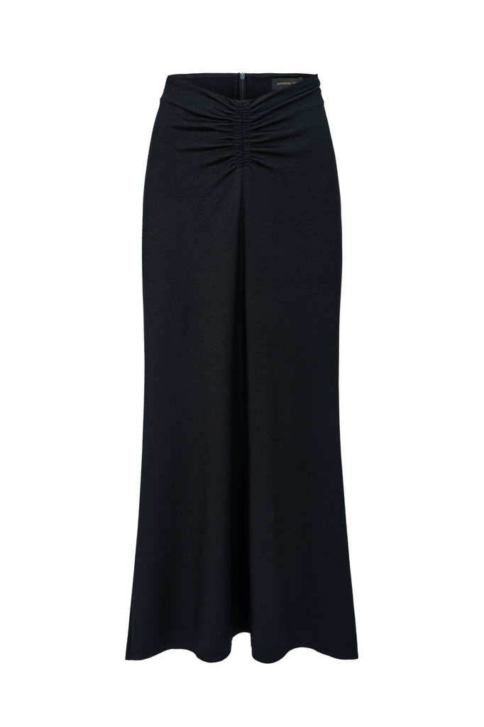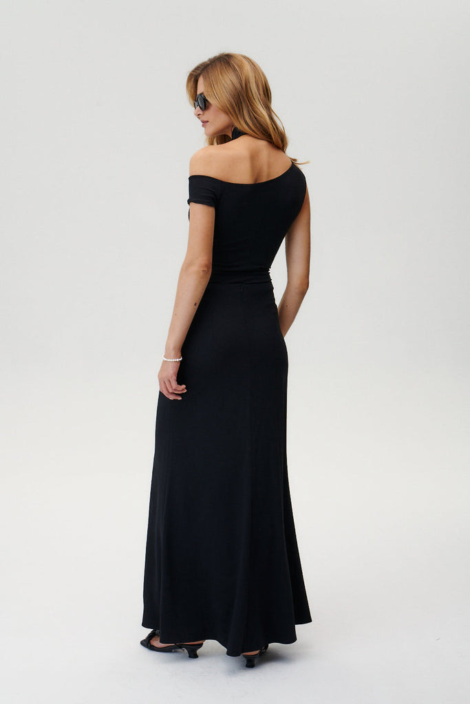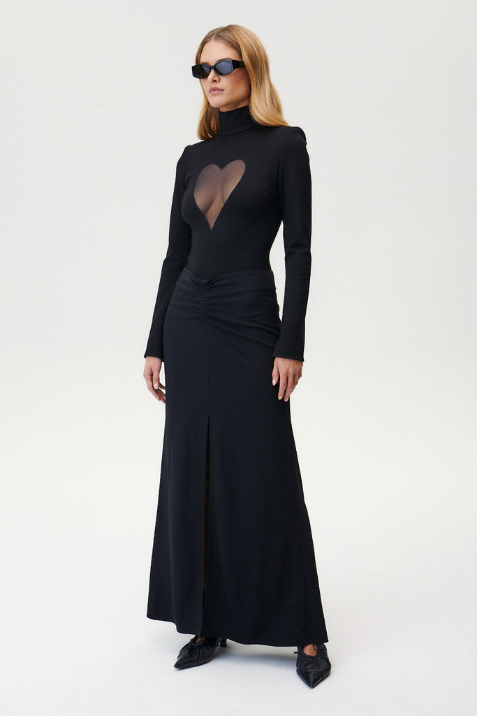 Elevate your wardrobe with this elegant black maxi skirt, featuring a chic cut-out detail and draped front for a touch of sophistication. Crafted from smooth, breathable viscose, it provides comfort while exuding timeless style. Perfect for pairing with your favorite bodysuit, this versatile piece is ideal for both formal occasions and stylish everyday looks.