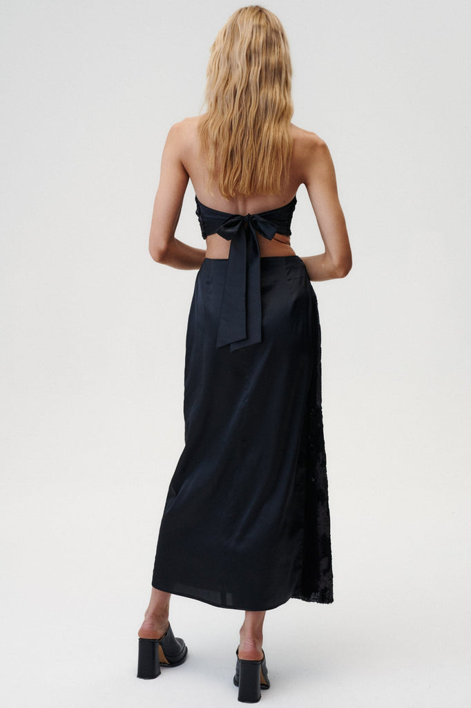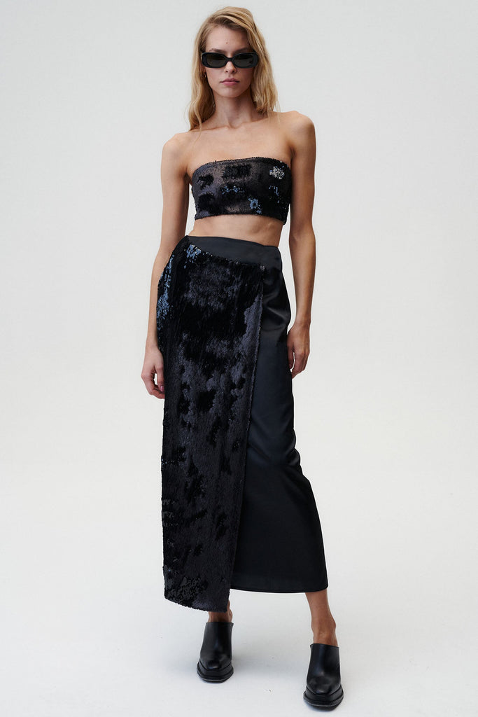 The ultimate modern look for those who want to combine glamour with bold style. The sleek top and skirt, made from shimmering sequins and smooth viscose and rayon, create a striking silhouette that exudes confidence.