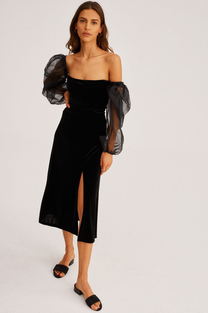 - Velvet midi skirt with a slight slit on the side.