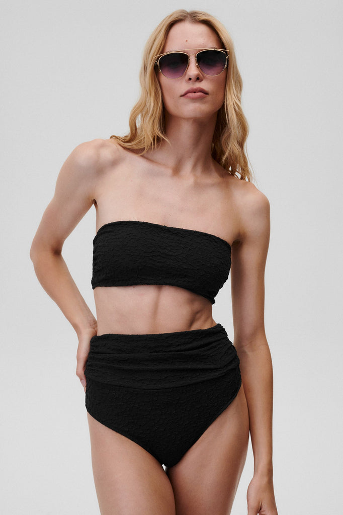 Beautiful texture, slight creasing and a high waist will ensure that even after endless amounts of gelato, the swimsuit will shape up and look great giving you confidence, because every body is a bikini body!