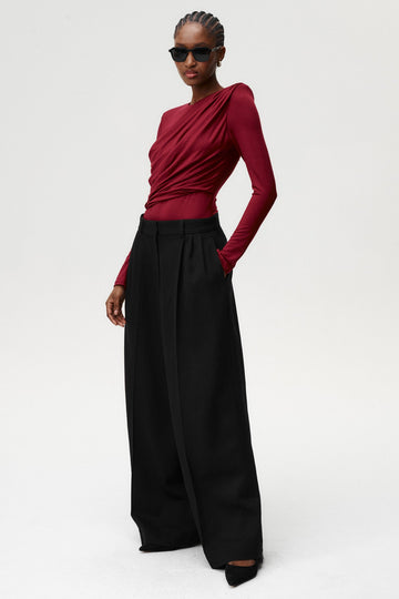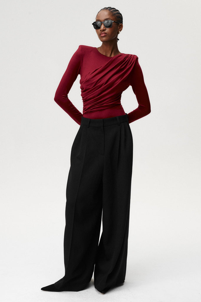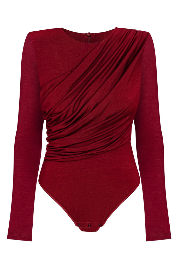 The perfect choice for colder days. A subtle, classic bodysuit with decorative draping to accentuate every silhouette. Style it with jeans for every day or a mini skirt and high boots for the evening. This shade of burgundy? It's that perfect deep red that works year-round. Sensual, feminine, and effortlessly sophisticated.