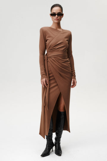 Audrey Dress in brown is elegance with substance. Made from a rich, weighty fabric, it drapes effortlessly while carrying a polished presence. The wrap silhouette features front pleats and a long belt that wraps twice at the waist. An asymmetric slit adds a subtle, contemporary edge. Its deep nut-brown shade with a hint of pink undertone evokes the warmth of autumn, giving it seasonal charm without feeling limited to one time of year. The soft, comforting fabric feels gentle against the skin, making it as cozy as it is sophisticated. Ideal for polished office looks or layered for elegant evenings.