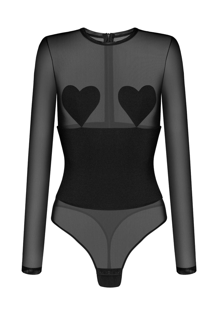 - Black bodysuit made of viscose blend and mesh.