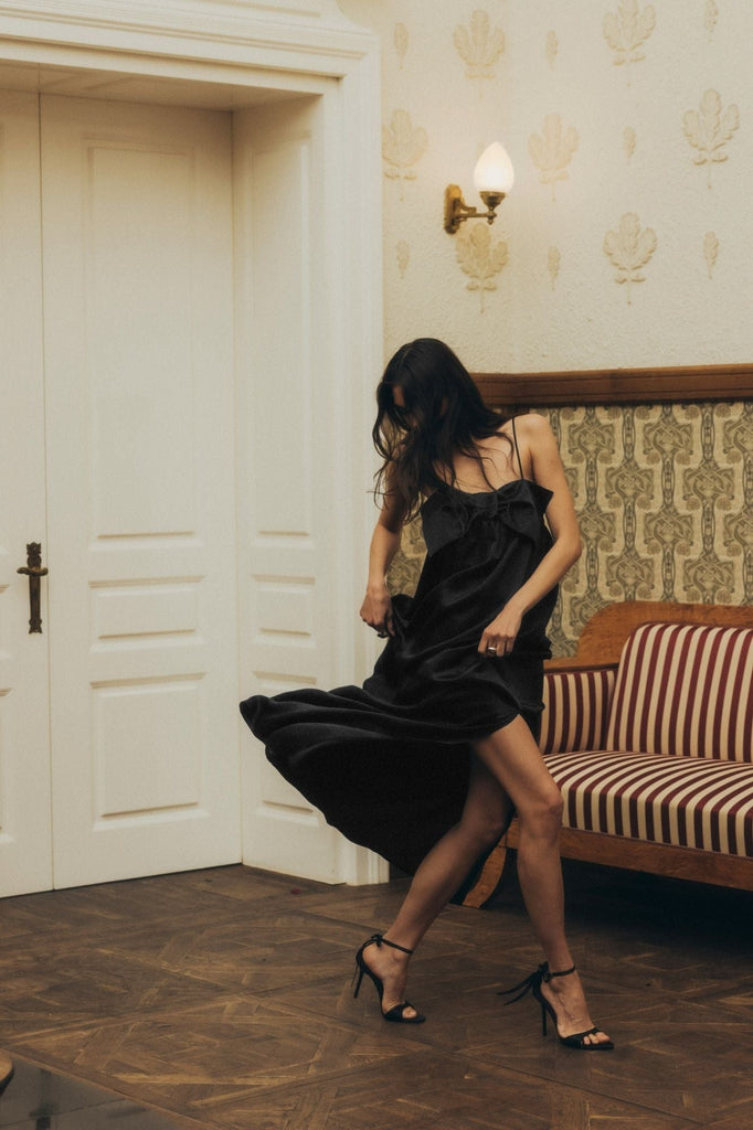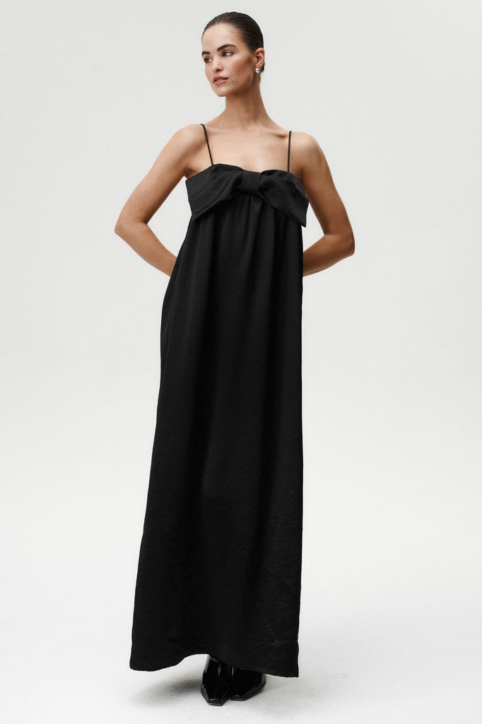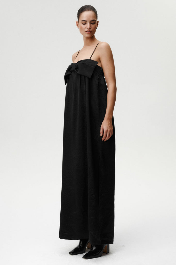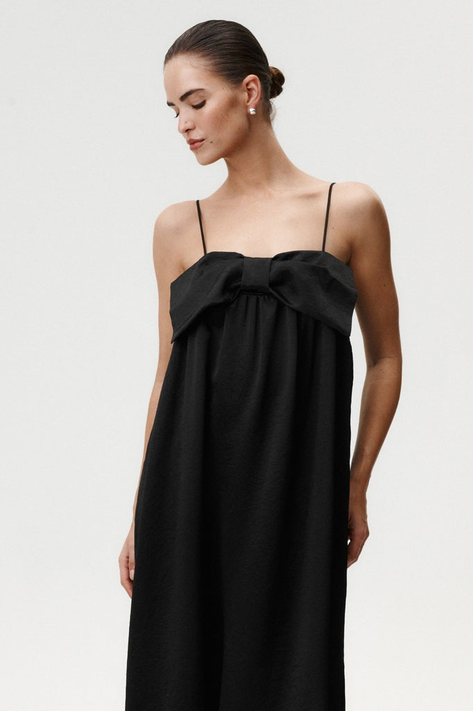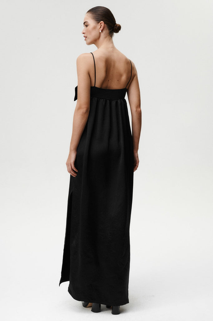 A modern take on timeless elegance. Belleza Dress is made from lustrous acetate fabric that drapes beautifully and moves with ease. The structured bow at the bust, secured at the top corners, adds a bold, feminine touch. Designed with spaghetti straps, soft gathers under the bust, and a side slit, it flatters the body while offering effortless comfort. The wide hemline gives it subtle volume, perfect for evenings that call for understated glamour.