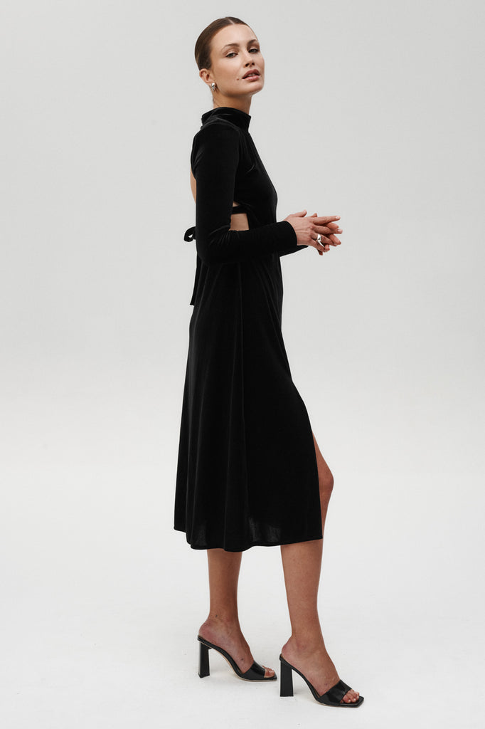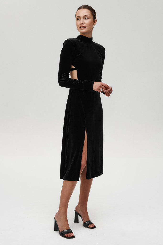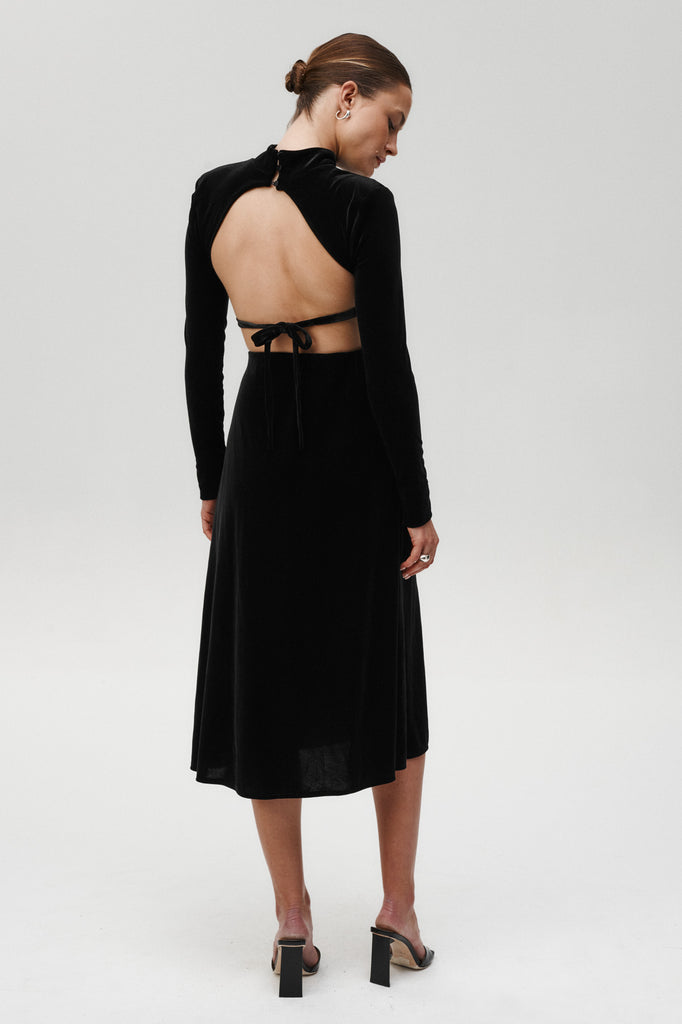 All romance and fun wearing Chéri Dress on the streets of Paris. It's here to turn heads with its backless design, flirty cutouts in the front and black velvet fabric. A go-to for all the go-to's at which you'll be humming Cheri Cheri Lady.