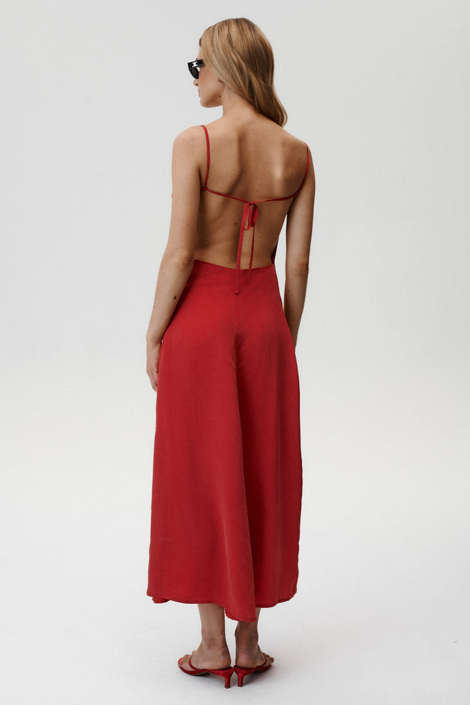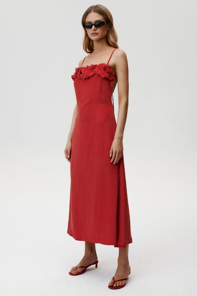 - A red coloured 7/8 length dress with a decorative red ruffle.