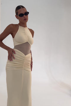 A halter maxi dress designed to highlight the beautiful lines of the body. The fit follows the figure closely, with soft ruching that shapes the form and adds texture throughout the design. The upper and lower parts are double layered, while a sheer mesh panel across the stomach introduces a subtle contrast and a hint of lightness. Fine straps tie at the neck, leaving the shoulders exposed. Ruching gently contours the body, while a slit on the left leg adds movement. Finished with a concealed zipper placed at the center back. A confident dress made for summer nights.