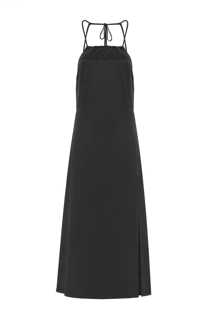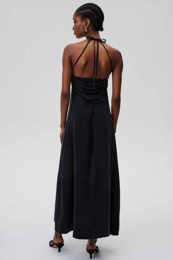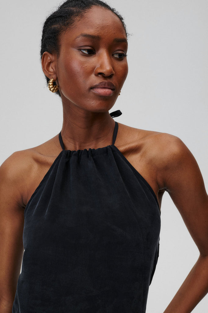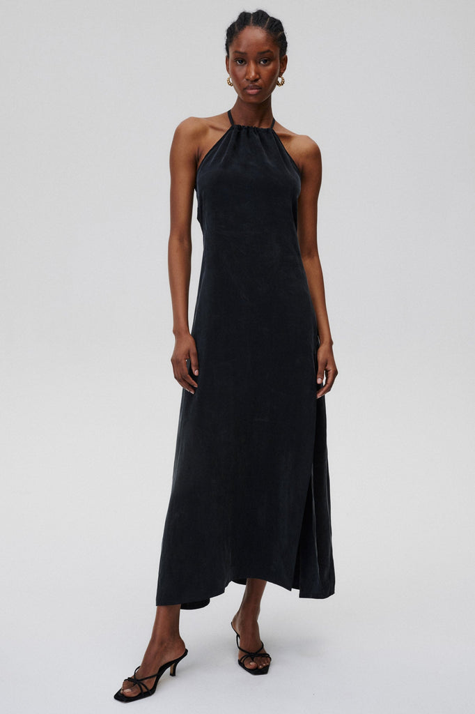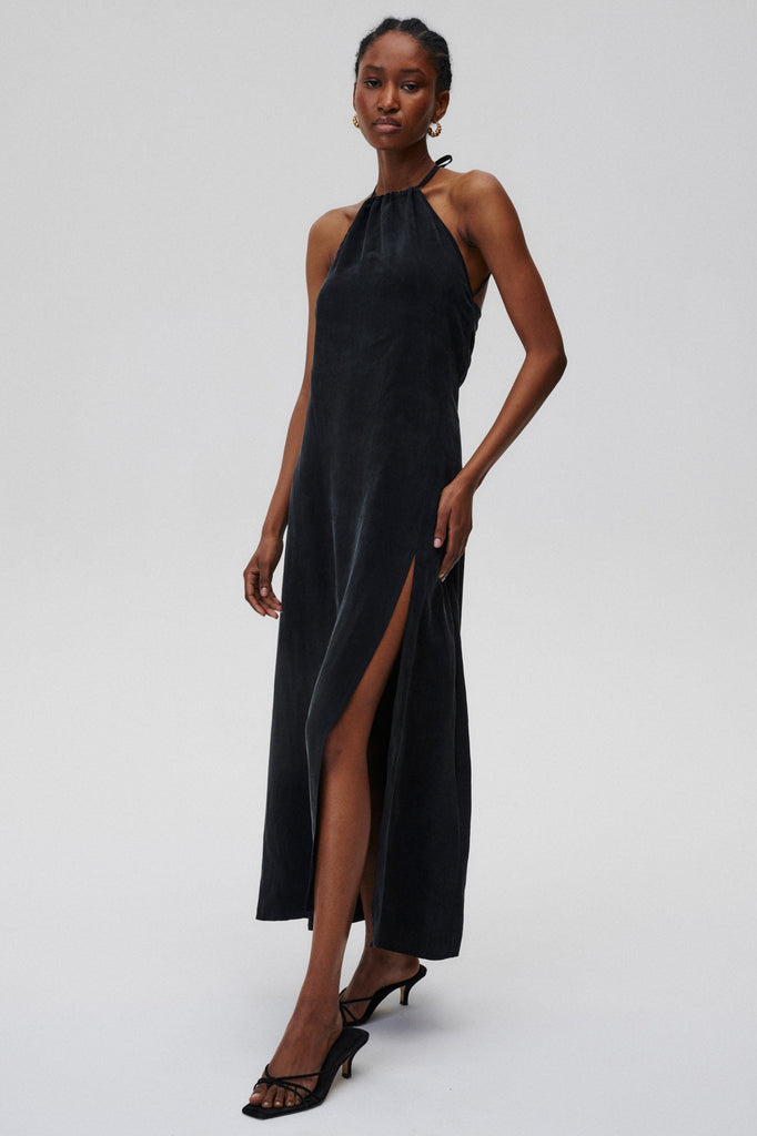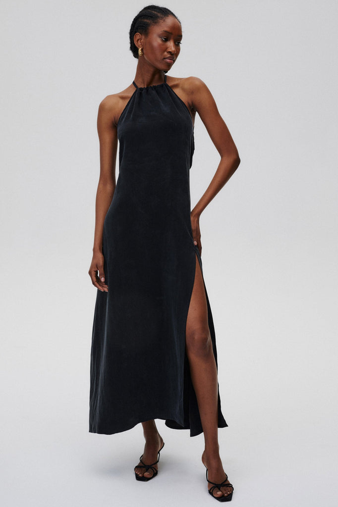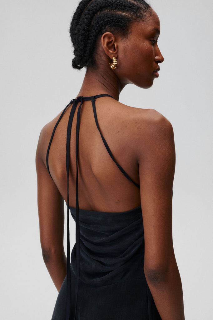 A dress that needs no accessories. Classic at the front, with a halter neckline and thigh-high cut-out, it delights at the back with its delicacy and nonchalant binding.
