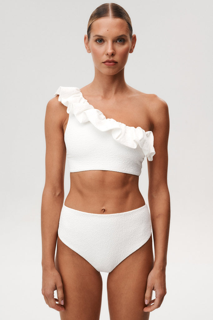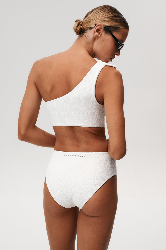 The timeless high-waisted cut is perfect for any figure - no matter what size you wear, you will look just supersexy. Wearing this bikini immediately makes us think of sweet summer, juicy fruit and tanned skin. The white colour will perfectly accentuate your tan, so all you need with this swimsuit to feel like a goddess is an airy shirt and your favourite flip-flops.