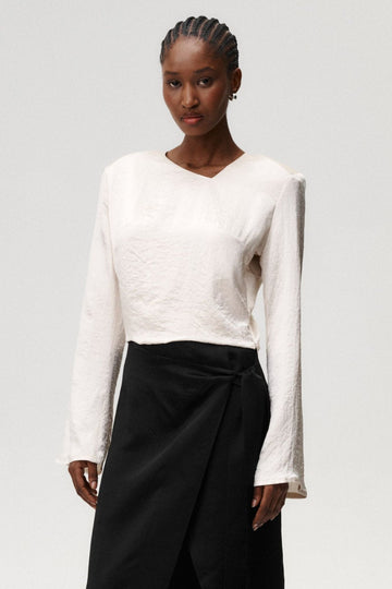 Her World Top is a quintessential Undress Code piece: elegant and refined front meets an unexpected and sexy back. The asymmetric neckline keeps its front sleek and understated, while the open back with a delicate center strap adds a very modern twist. Made from satin acetate with a soft, creased finish, the fabric drapes lightly and catches the light with movement. Detachable shoulder pads let you choose your level of drama, while the cropped length keeps the silhouette playful yet polished. Pair it with high-waisted trousers for a polished look or style it with a flowing skirt for an effortlessly elegant evening.
