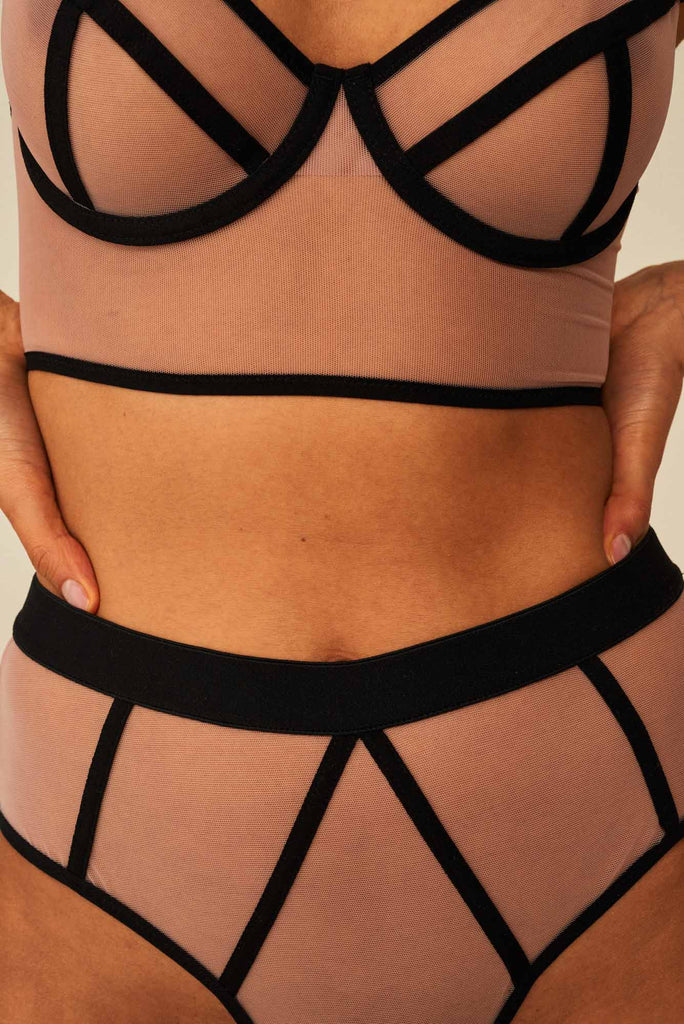 Classic, corset cut and made of slightly dark pink French mesh with black details may get you in trouble, but only the pleasant one.