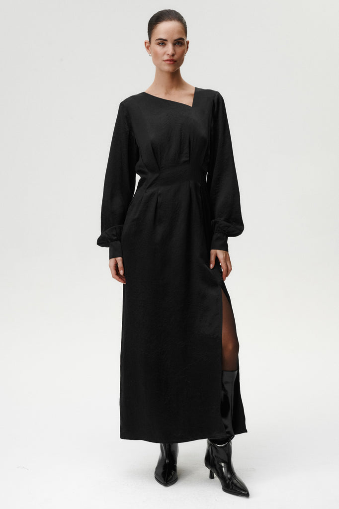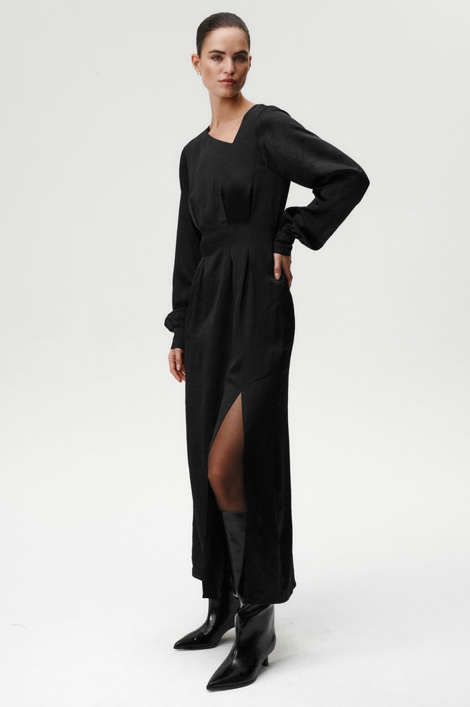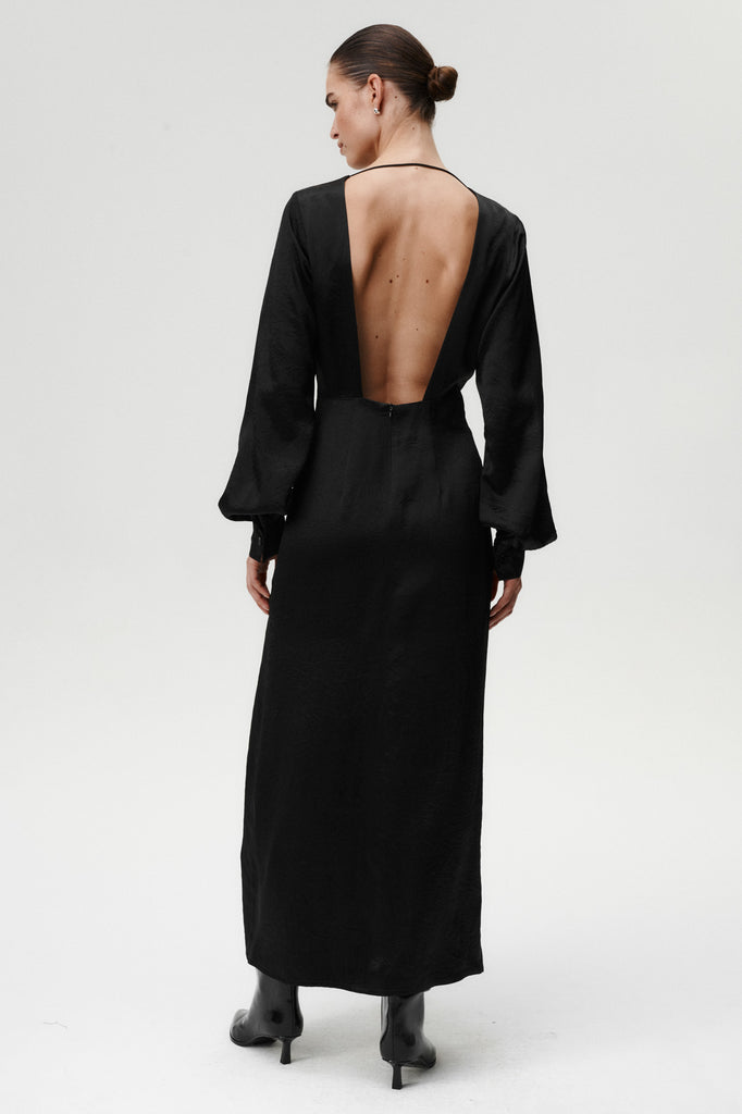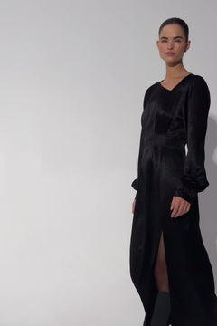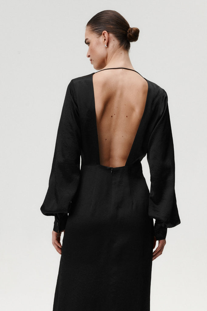 A study in refined drama. Jane Dress is crafted from acetate with a viscose lining for a smooth, luxurious feel. Simply put, this dress was made to make an impression. The pleated waist highlights the figure, while the open back, finished with a delicate spaghetti strap at the neck, adds a sensual twist. A side slit brings movement, and the wide hem gives it graceful volume. The puffed sleeves end in distinctive engraved-button cuffs, echoing the craftsmanship of our signature shirts. Elegant, bold, and unmistakably modern.