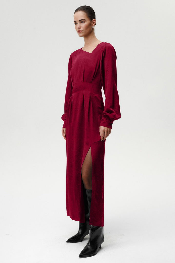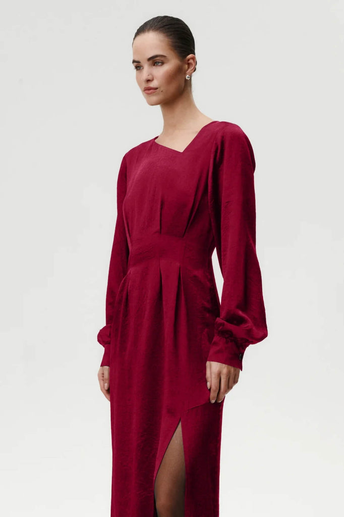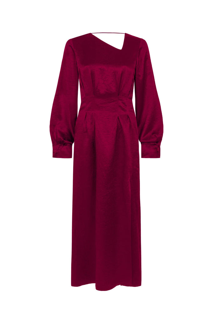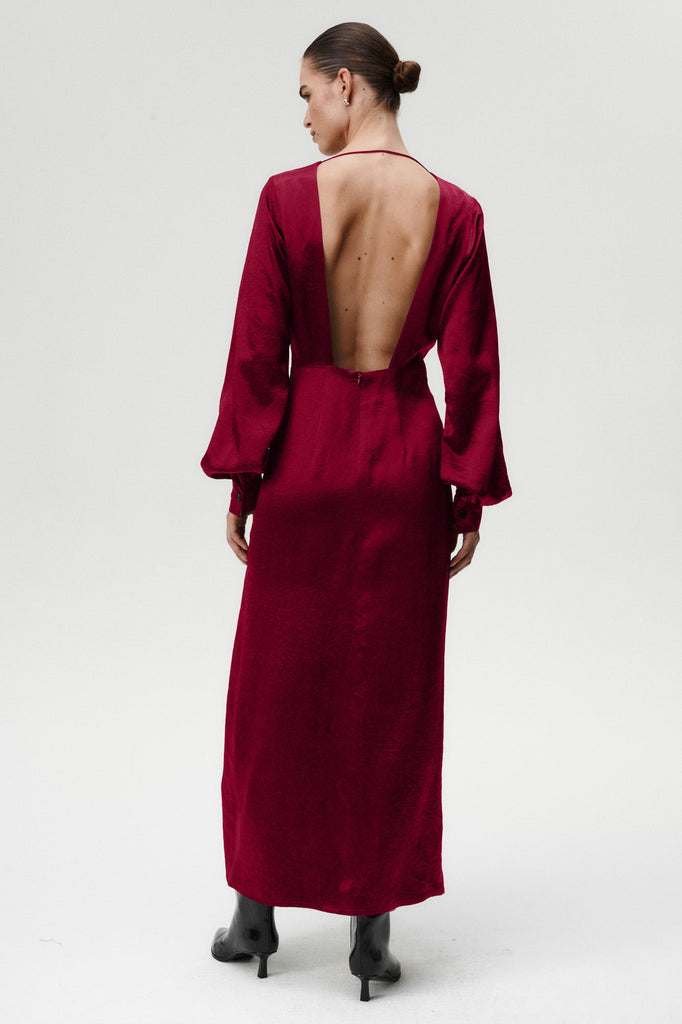 A study in refined drama. Jane Dress is crafted from acetate with a viscose lining for a smooth, luxurious feel. Simply put, this dress was made to make an impression. Its burgundy color makes it stand out - elegant and perfect for the season. The pleated waist highlights the figure, while the open back, finished with a delicate spaghetti strap at the neck, adds a sensual twist. A side slit brings movement, and the wide hem gives it graceful volume. The puffed sleeves end in distinctive engraved-button cuffs, echoing the craftsmanship of our signature shirts. Elegant, bold, and unmistakably modern.