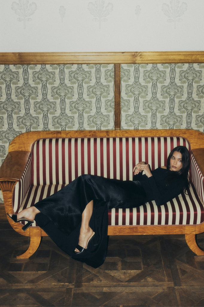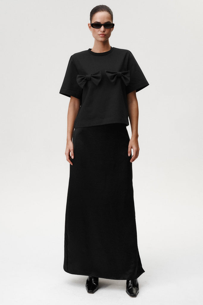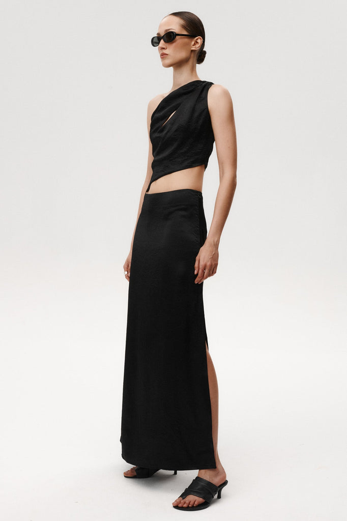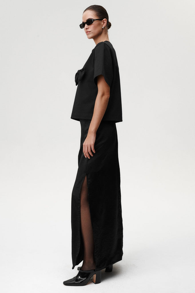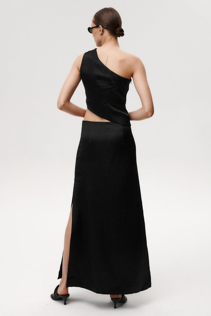 Mary Jane Skirt is the kind of classic you’ll keep forever. Simple at first glance, but far from ordinary. This black maxi skirt is cut from smooth acetate that moves beautifully with every step. It fastens with a hidden side zip and features a left-side slit for just the right amount of edge. Flared toward the hem, it gives a graceful, elongated shape that works with everything - from a sleek bodysuit to an oversized shirt. A true wardrobe essential with endless styling power.