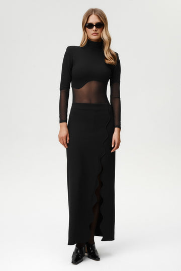 - Bodysuit with sculpted mesh panels and flowing wave lines for support and shaping.