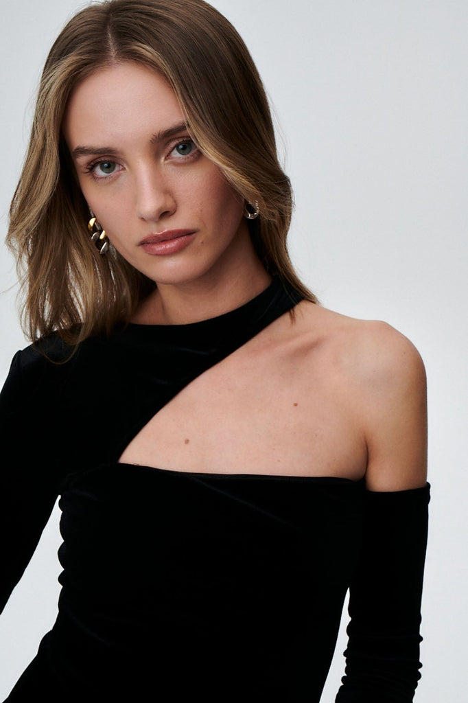 Black velvet mini with a lot of nonchalance. A classic cut, a cut-out that beautifully emphasises the shoulders and a deep black colour. This dress doesn't need anything, it just is - stunning and elegant.