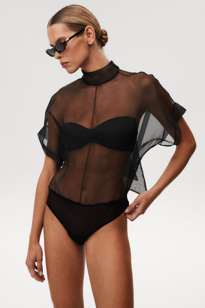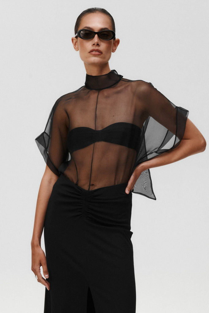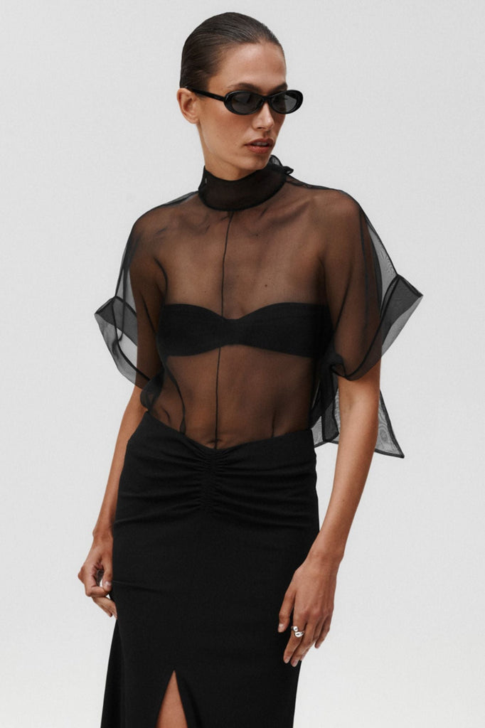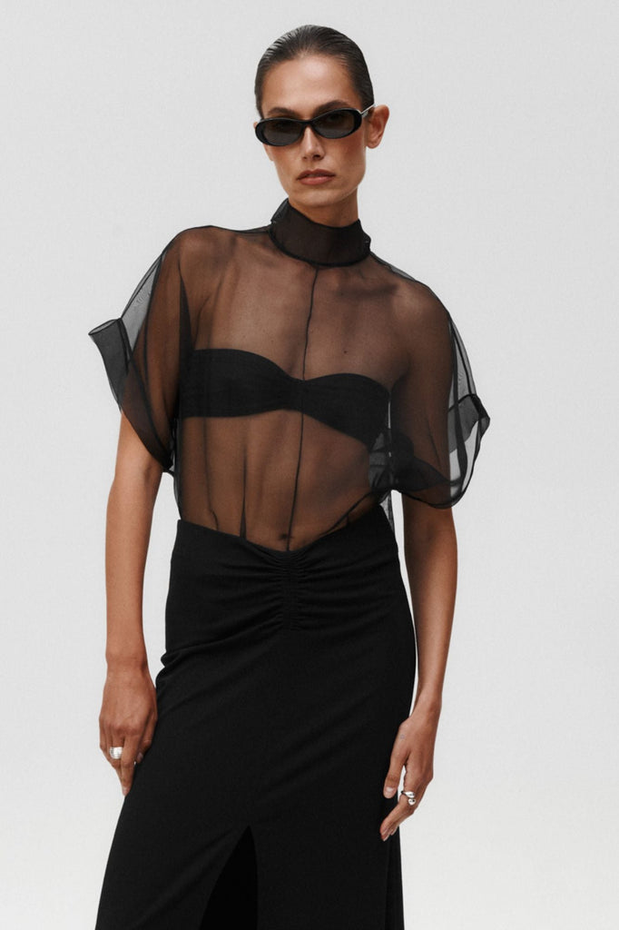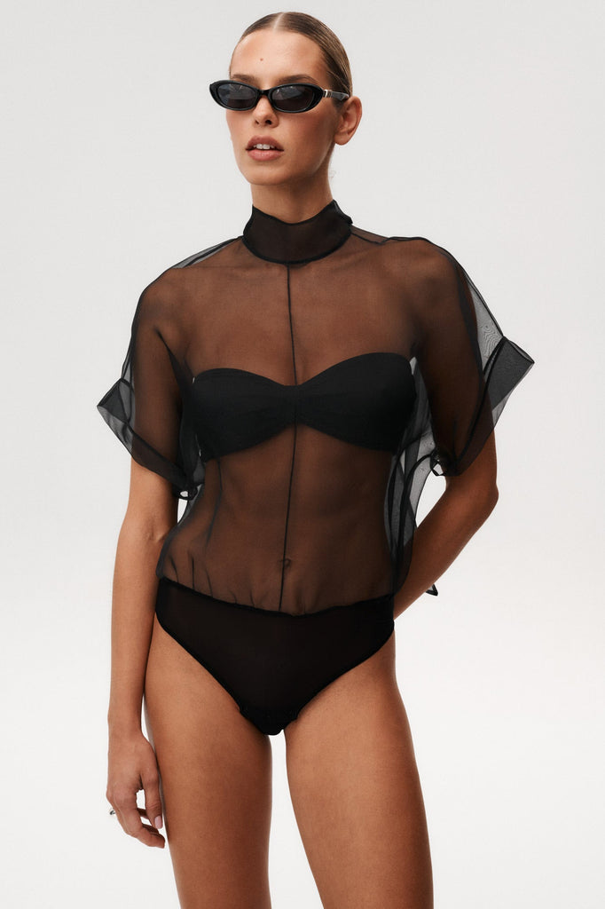Black silk organza at its best, sheer, light and perfectly balanced. The kimono sleeve comes without an armhole cut, giving a modern line. A front slit and a high neckline that flows into a petite tie scarf at the back create a striking yet minimal detail. The back fastens with a zipper, and the base is finished with soft and second-skin feeling tencel. Designed for versatile, elevated styling. layer it with intention: for a clean, modern look choose our Essential Top or No Ordinary Love Bra and for more feminine, match it with Bliss or Gentle Bras.