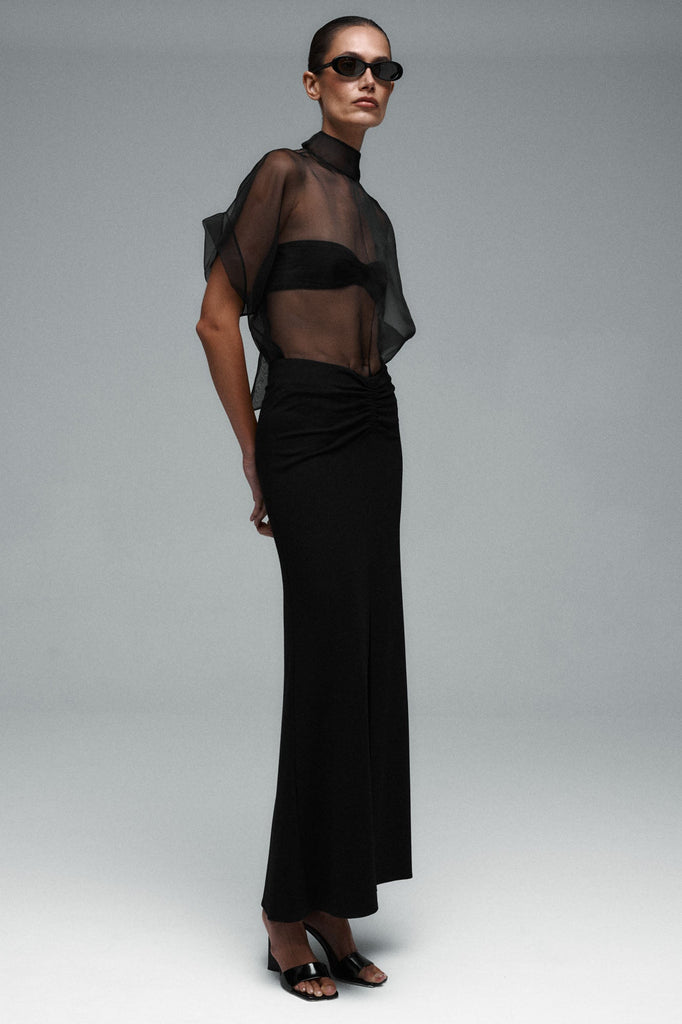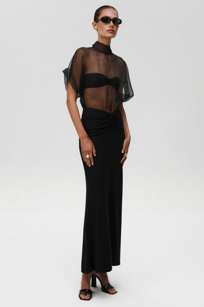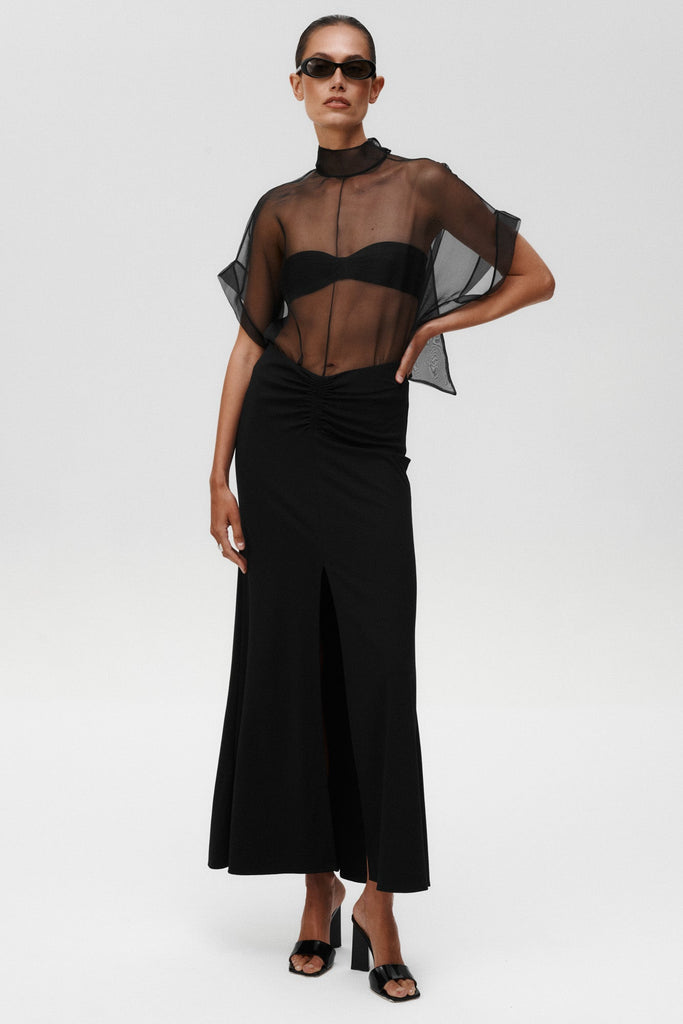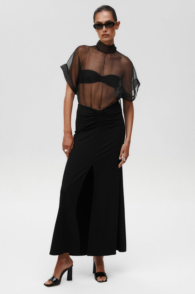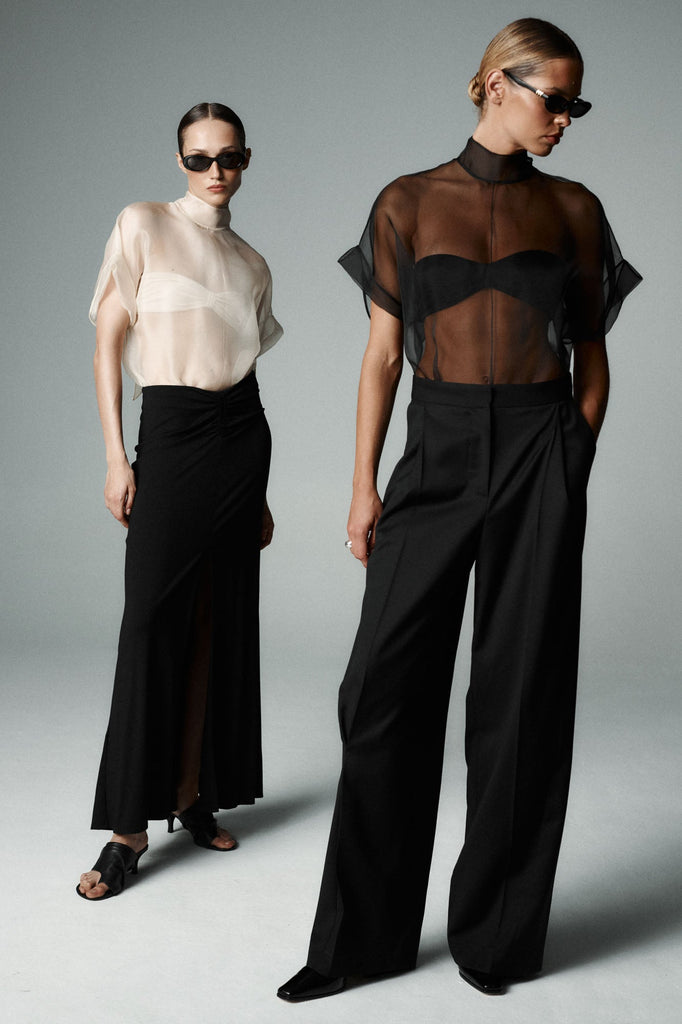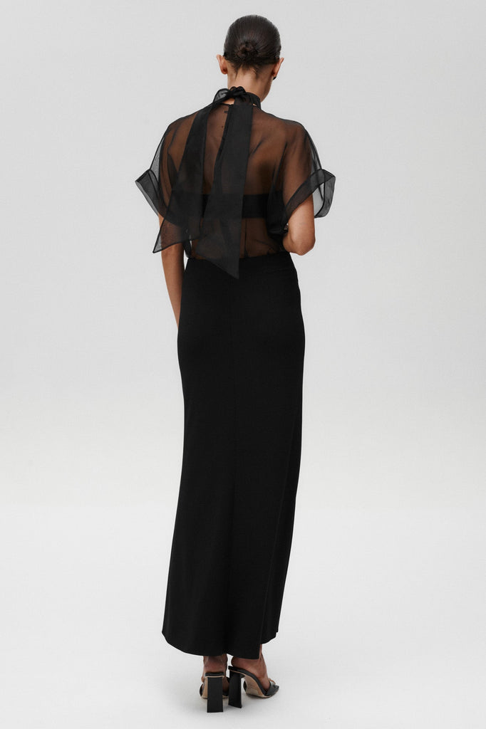 Black silk organza at its best, sheer, light and perfectly balanced. The kimono sleeve comes without an armhole cut, giving a modern line. A front slit and a high neckline that flows into a petite tie scarf at the back create a striking yet minimal detail. The back fastens with a zipper, and the base is finished with soft and second-skin feeling tencel. Designed for versatile, elevated styling. layer it with intention: for a clean, modern look choose our Essential Top or No Ordinary Love Bra and for more feminine, match it with Bliss or Gentle Bras.