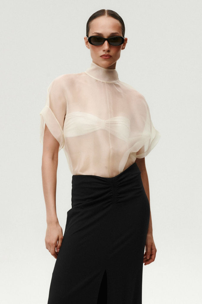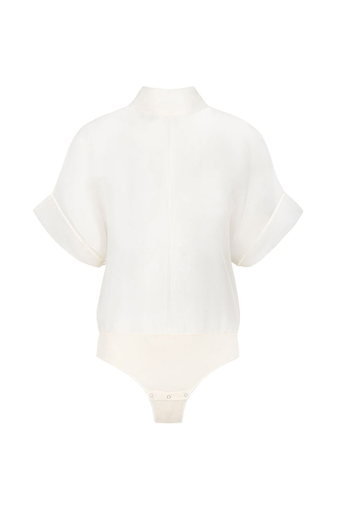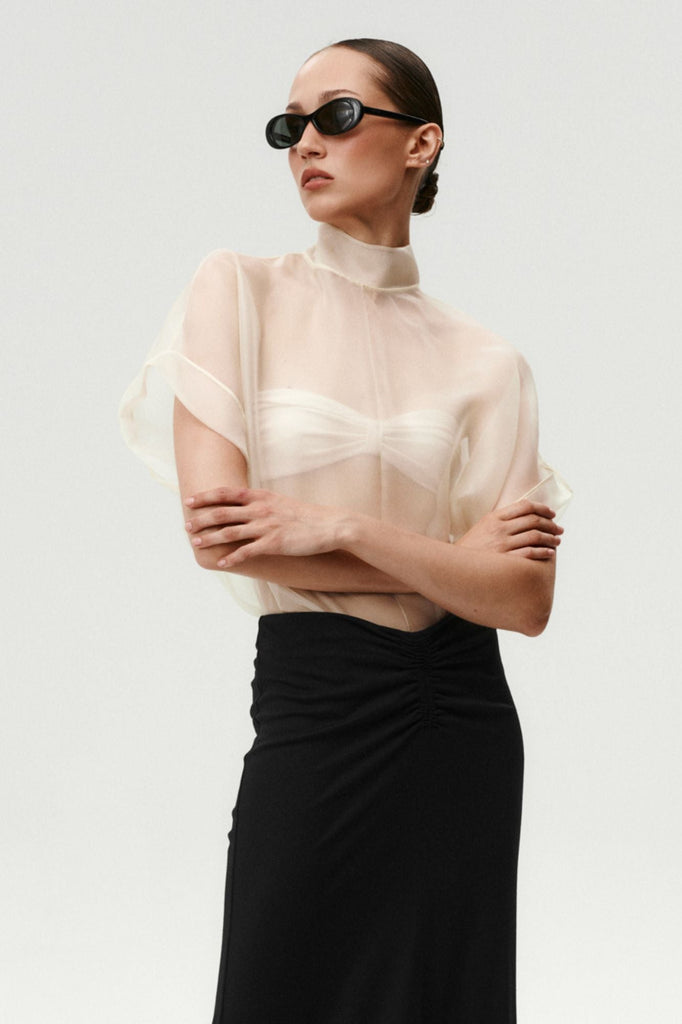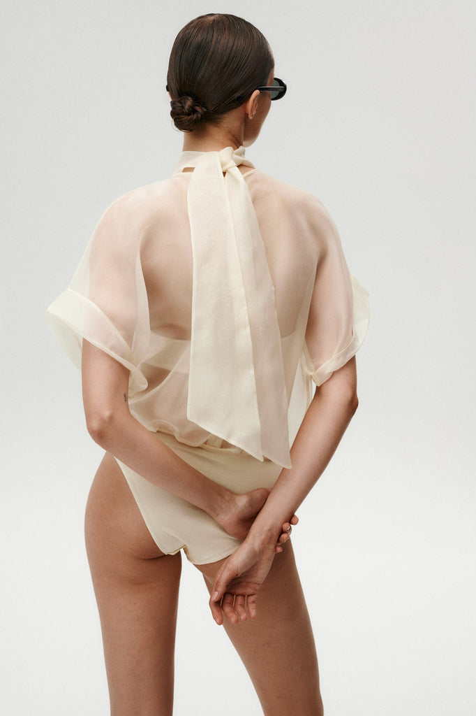 Cream silk organza at its best, sheer, light and perfectly balanced. The kimono sleeve comes without an armhole cut, giving a modern line. A front slit and a high neckline that flows into a petite tie scarf at the back create a striking yet minimal detail. The back fastens with a zipper, and the base is finished with soft and second-skin feeling tencel. Designed for versatile, elevated styling, this bodysuit is perfect for creating a refined, polished look with subtle sophistication.