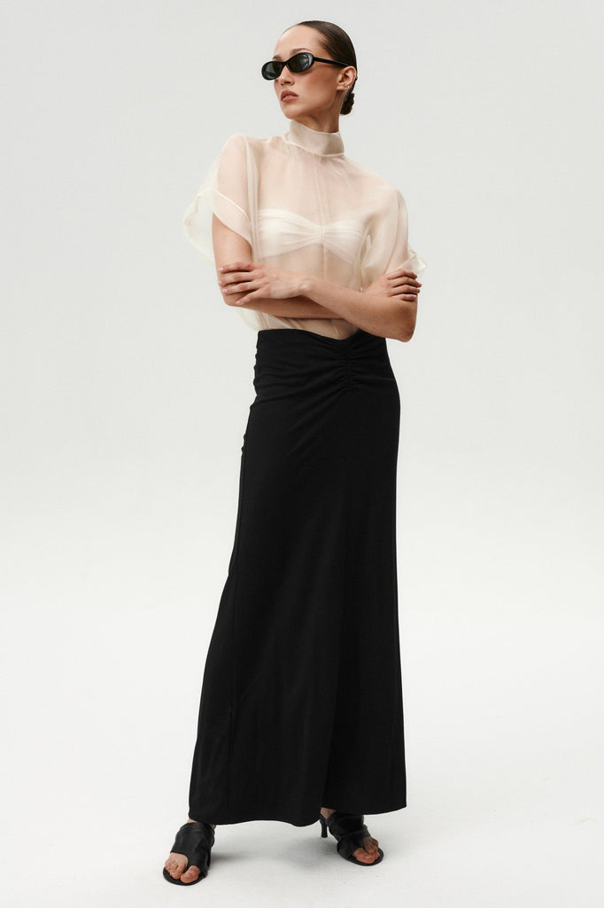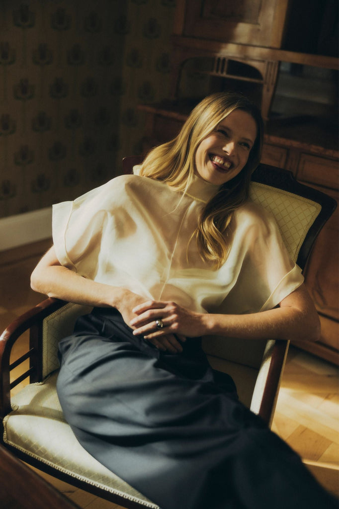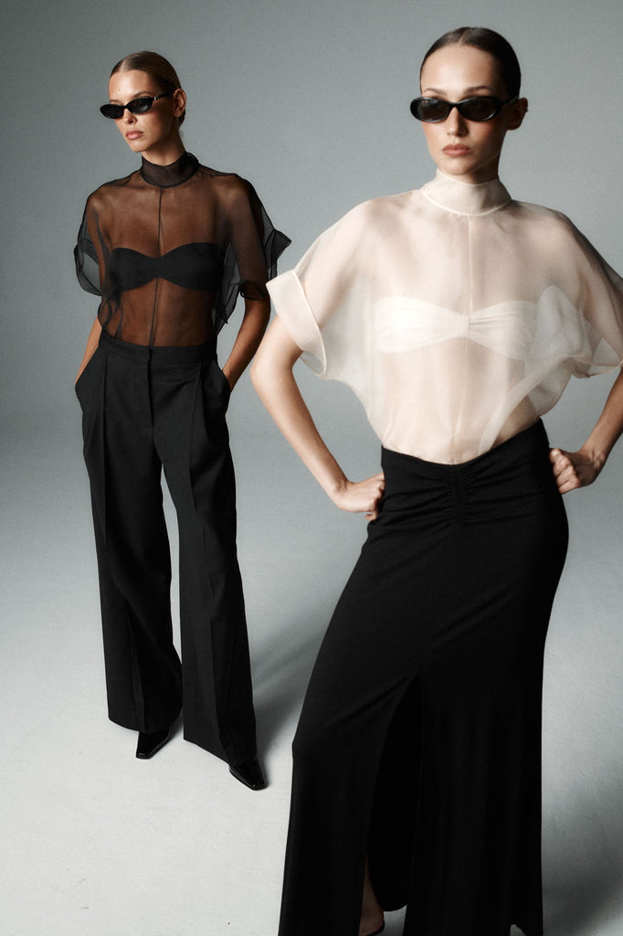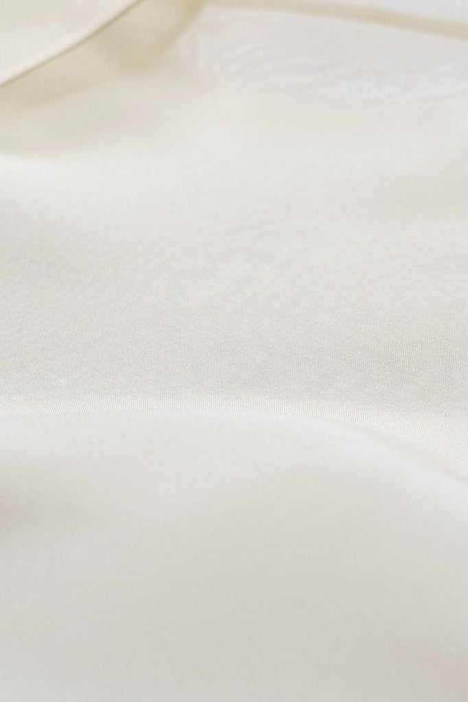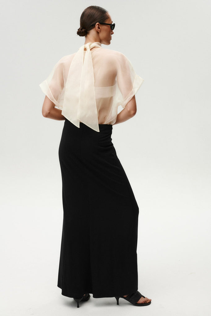Cream silk organza at its best, sheer, light and perfectly balanced. The kimono sleeve comes without an armhole cut, giving a modern line. A front slit and a high neckline that flows into a petite tie scarf at the back create a striking yet minimal detail. The back fastens with a zipper, and the base is finished with soft and second-skin feeling tencel. Designed for versatile, elevated styling, this bodysuit is perfect for creating a refined, polished look with subtle sophistication.