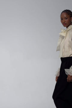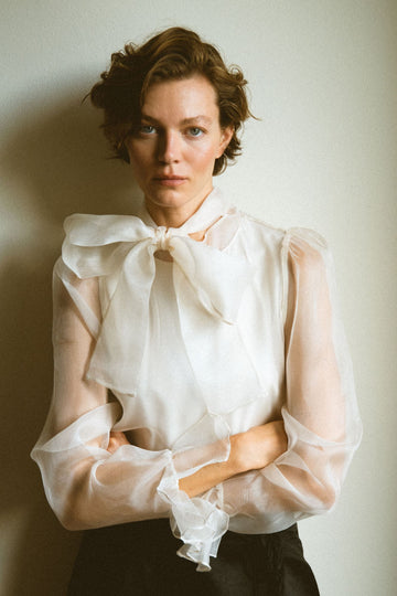 For those who see elegance in the details. Pure Elegance Bodysuit is a modern classic reborn - now available in cream. This piece combines sophistication with a subtle hint of allure. The sheer, weightless sleeves contrast with a fully lined body for perfect coverage, while the airy bow at the neckline works like jewelry. Crafted from fine silk organza with a soft tencel lining, every detail is thoughtfully designed. Whether paired with long tailored trousers or styled with a skirt for late nights out, Pure Elegance turns minimal effort into understated elegance.
