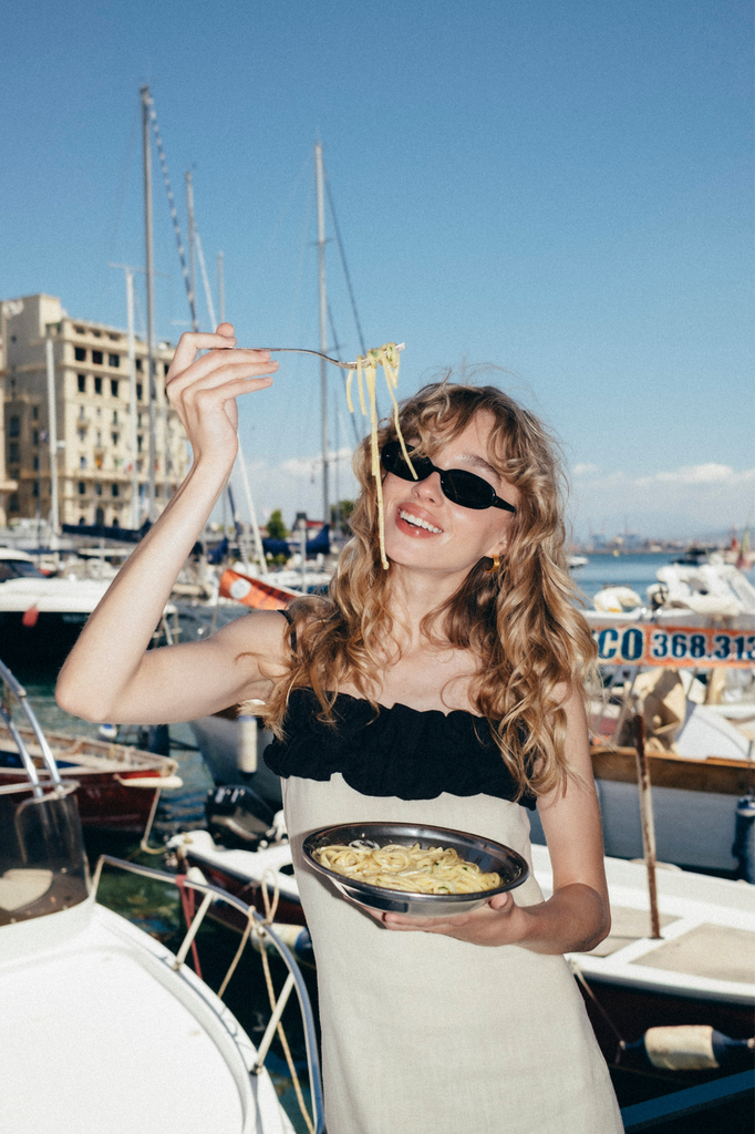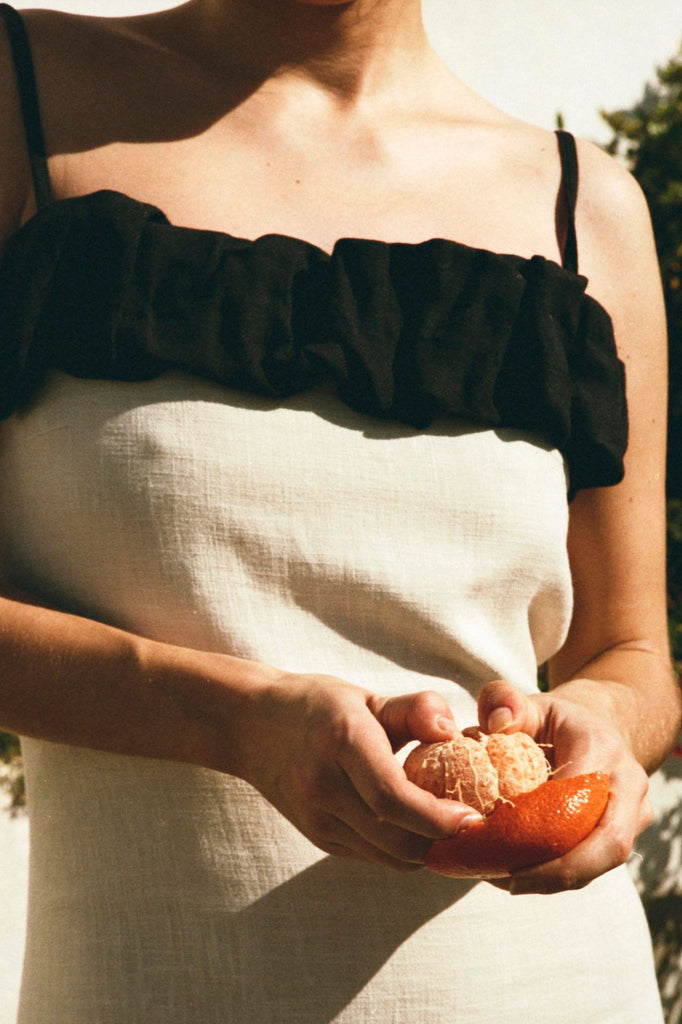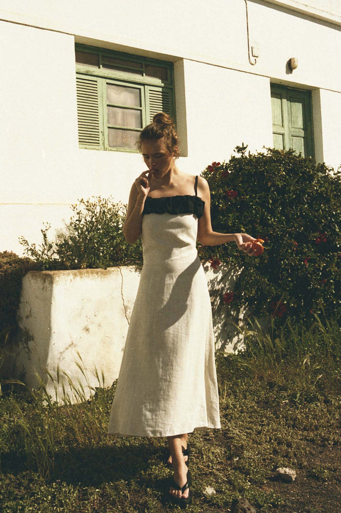 A dress for any summer occasion, depending on the accessories you choose. A simple, minimalist cut enriched with a decorative ruffle at the neckline and an open back with ties. Extremely charming, feminine and delightful in its simplicity. I wonder how many times someone will shout Ciao Bella! to you as you stroll down the narrow Italian streets in this dress.