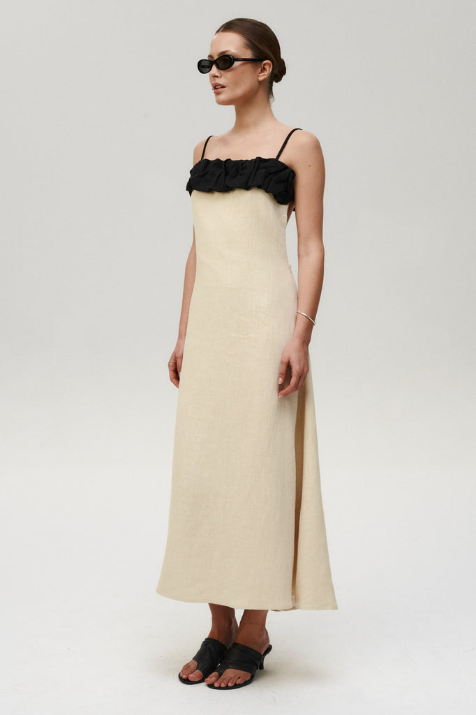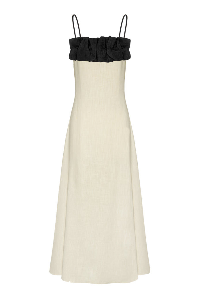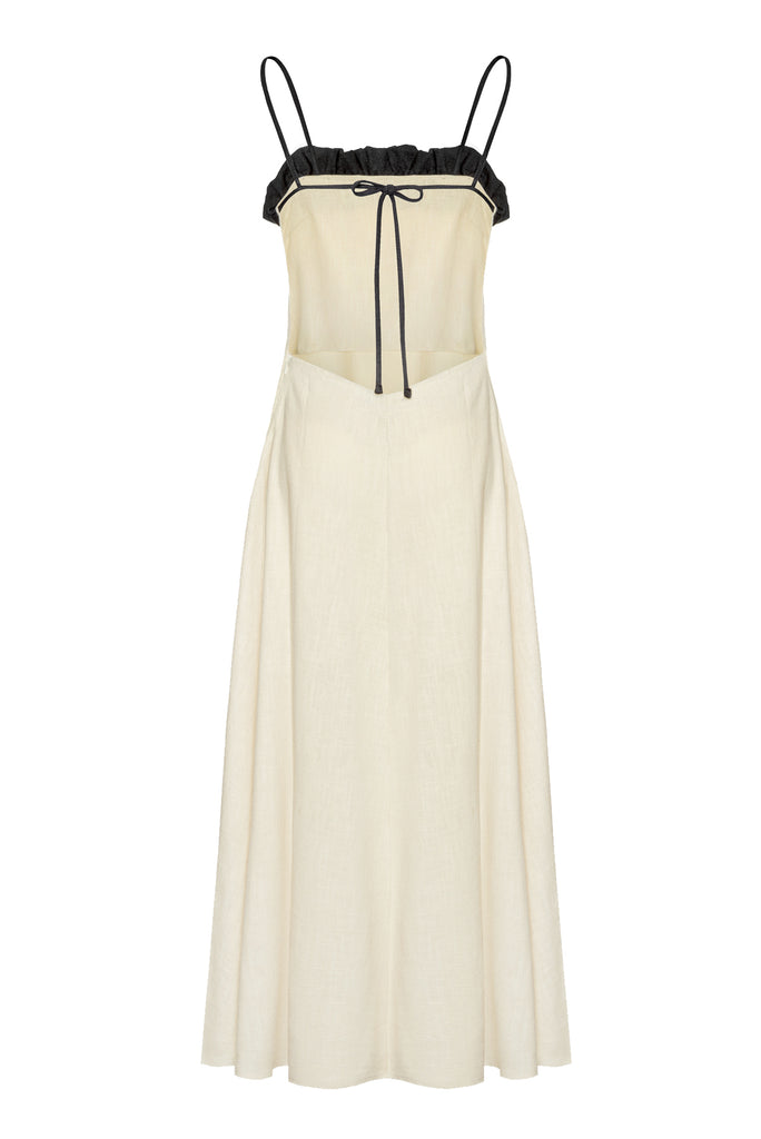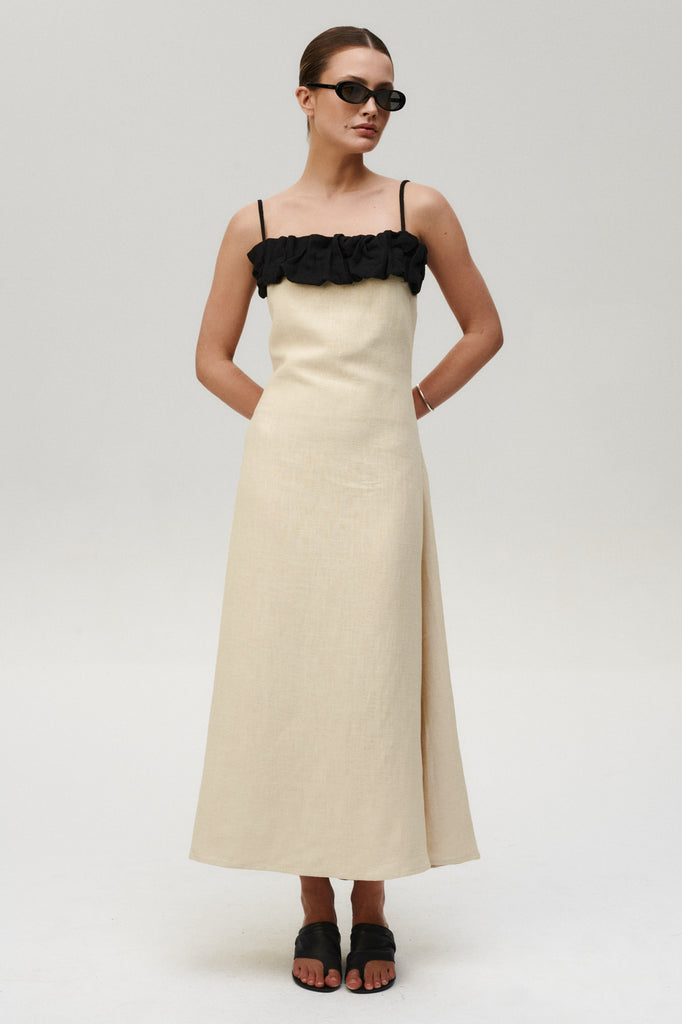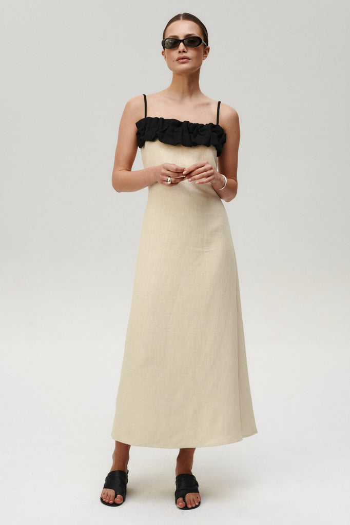 - A sand coloured 7/8 length dress with a decorative black ruffle.